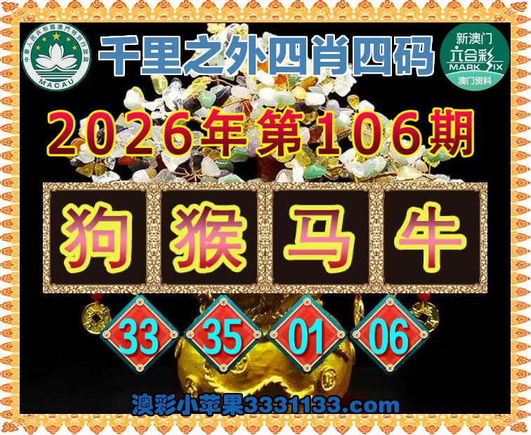 106期:《千里之外》 四肖四码【狗猴马牛】【33.35.01.06】开:鸡22